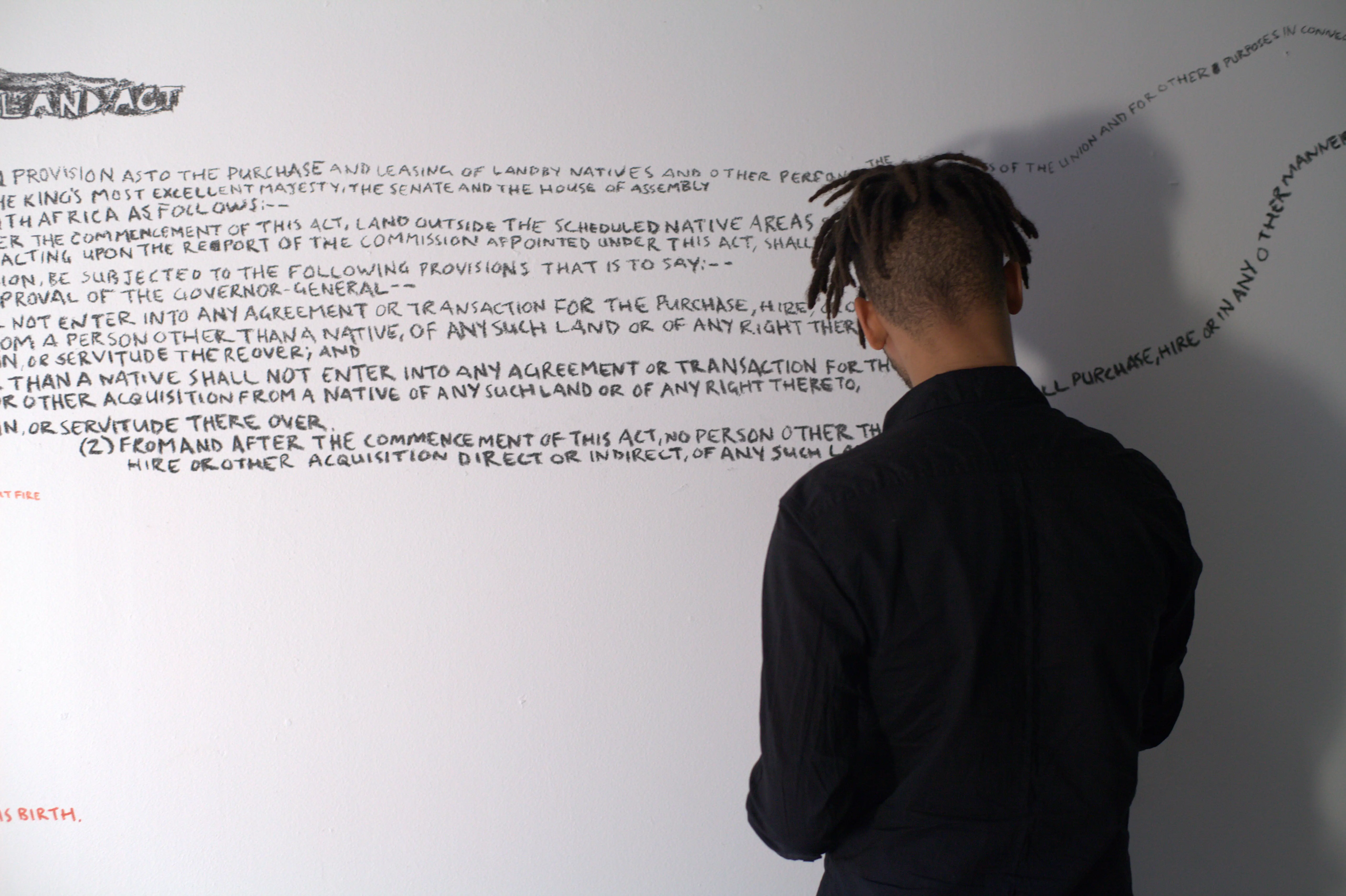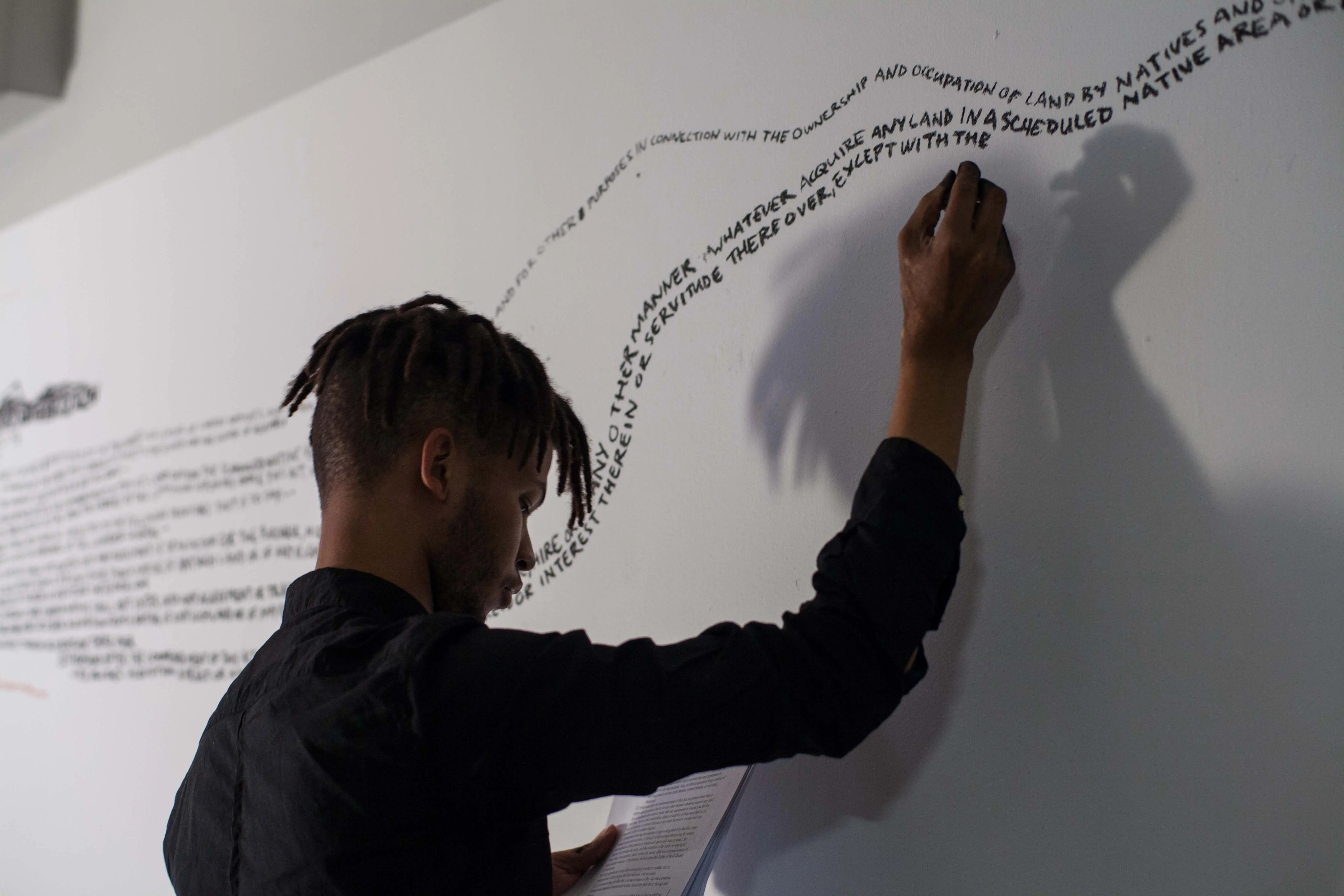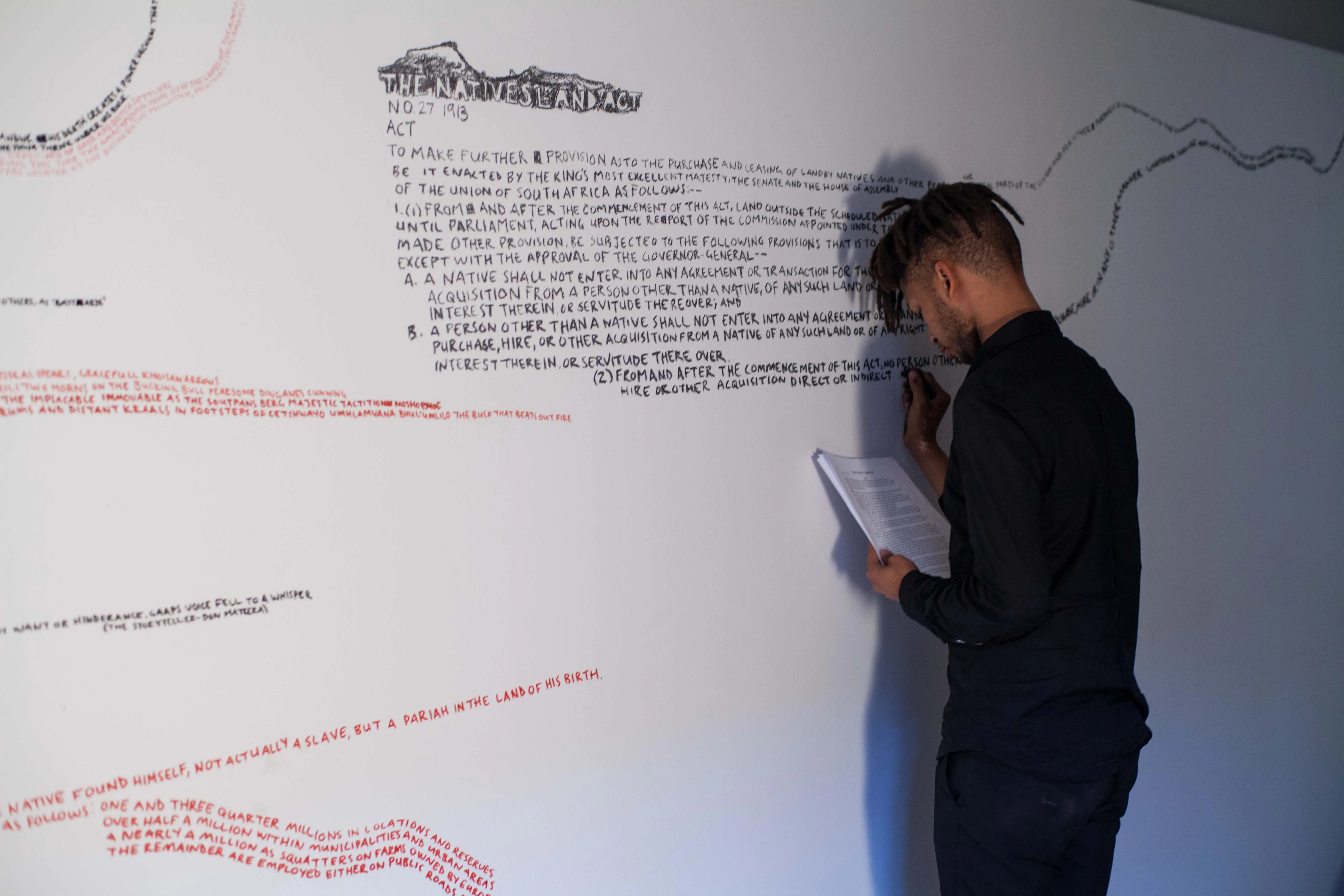 Constant Transition: Memorial Landscape is a research-based textual/figural intervention examining the history of South African land and land conflict through the reiteration of 500 years of historical record beginning in 1488. The work consisted of four days of continuous writing by hand of over 300,000 words from sources including, historical accounts, poems, novels, studies and academic papers, simultaneously aiming to open the archive to inspection and to reveal the inadequacy of the historical record and thus the narrative.