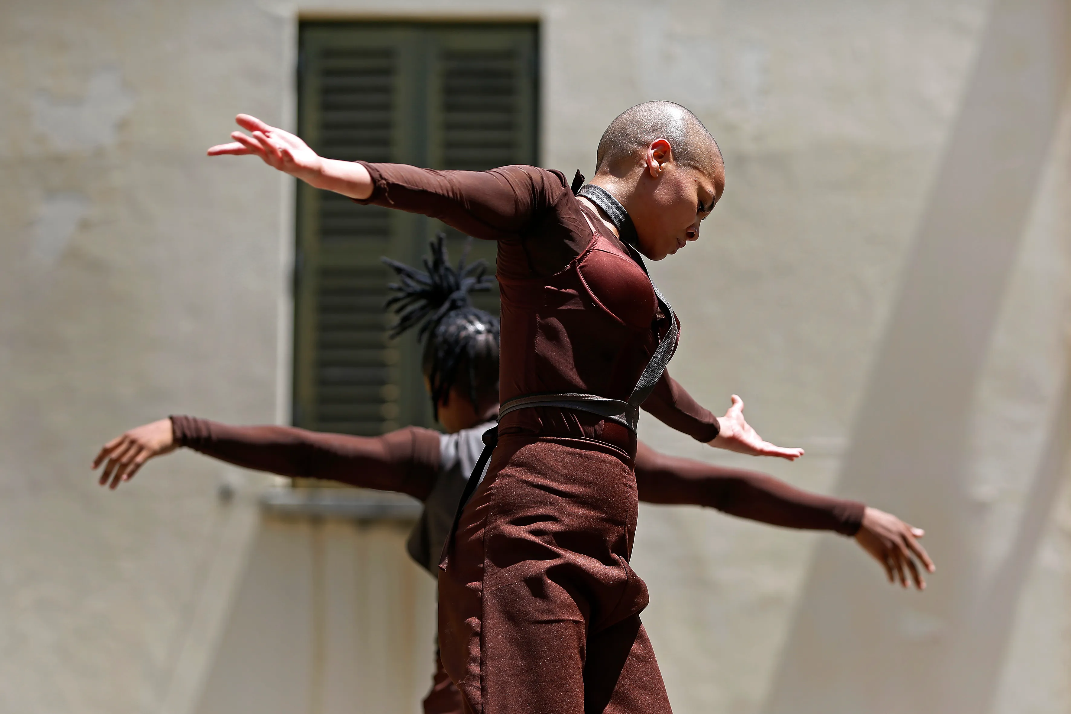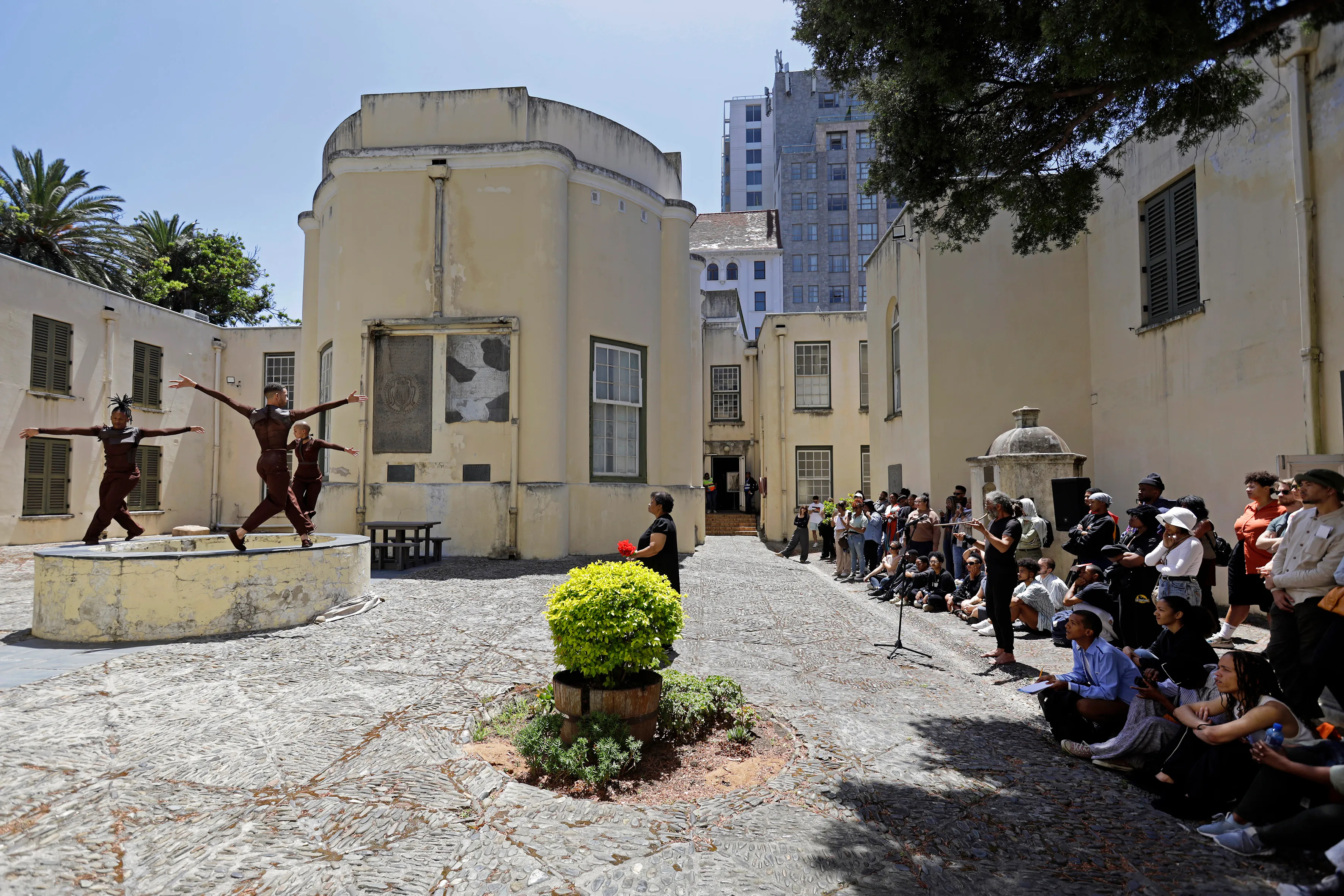 Torogo Denver is a Khoikhoi First Nation activist and writer who challenges the kakapusa or erasure of the Khoikhoi language and narratives. He helped construct the work with Darion Adams, an artist, dancer, dance educator, choreographer, project coordinator and facilitator who choreographed this performance. They are the founders of The AIM Society, an organization that contributes to the cultural landscape of Manenberg and surrounding communities by producing art spaces that engage the community. Adams is a graduate of the University of Cape Town’s Centre for Theatre, Dance & Performance Studies as well as the Jazzart Dance Theatre.